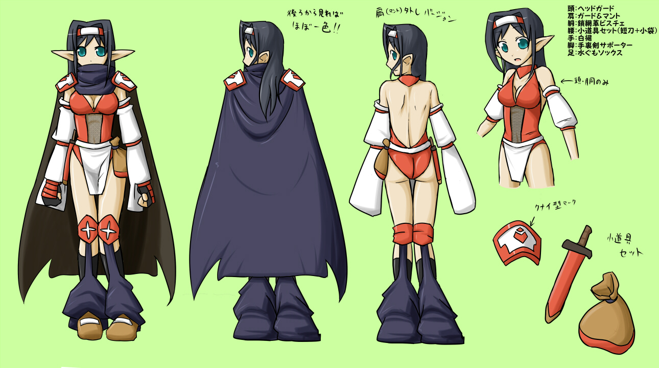 一応くノ一をイメージ。とか言いつつ全然ちげぇとか巫女っぽいとか言われても仕方ない品に。 単純にマントが欲しかっただけなのかもしれない。マントー('A`